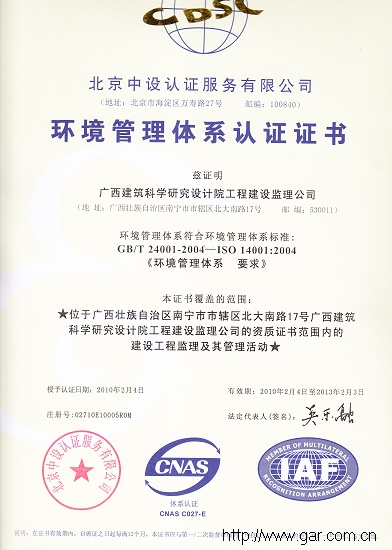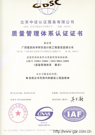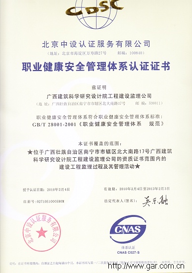廣西建筑科學(xué)研究設(shè)計(jì)院工程建設(shè)監(jiān)理公司,于2010年1月16日通過了北京中設(shè)認(rèn)證服務(wù)有限公司對我公司:“質(zhì)量、環(huán)境、職業(yè)健康安全管理三位一體的管理體系認(rèn)證。2010年2月4日正式簽發(fā)授予:“GB/T19001-2008《質(zhì)量管理體系》”;“GB/T24001-2004《環(huán)境管理體系》”;“GB/T28001-2001《職業(yè)健康安全管理體系》”標(biāo)準(zhǔn)管理體系的認(rèn)證證書。