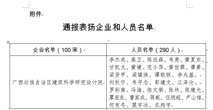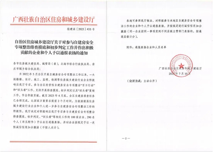 7月10日,自治區(qū)住建廳對參與自建房安全專項整治排查摸底和初步判定工作并作出積極貢獻(xiàn)的100家企業(yè)、290名個人予以全區(qū)通報表揚。我院及李杰成等31名參與此項工作的技術(shù)骨干獲得表揚。我院獲一次性誠信信用加分激勵。