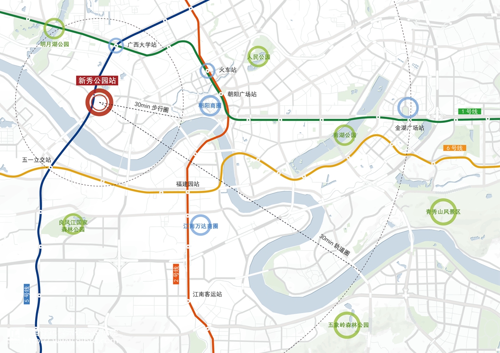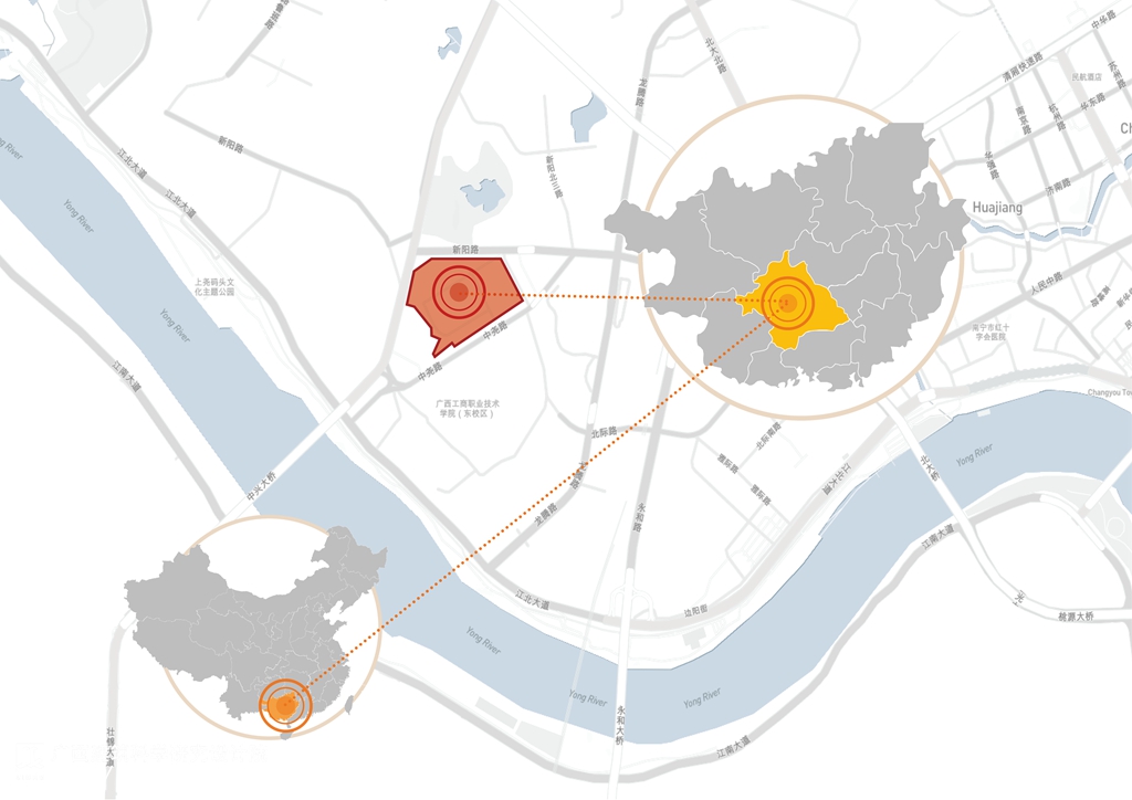 項目位于中堯路48號原南寧機械廠舊址,區(qū)位上毗鄰朝陽商圈,位于東西城市發(fā)展軸和邕江城市河流之間。場地周邊交通能級較高,利用TOD 軌交系統(tǒng)輻射城市大部分區(qū)域,半小時內直達新老城區(qū)核心商務圈,影響力較大。項目用地面積約 221 畝,總建筑面積約 9.95 萬平方米。