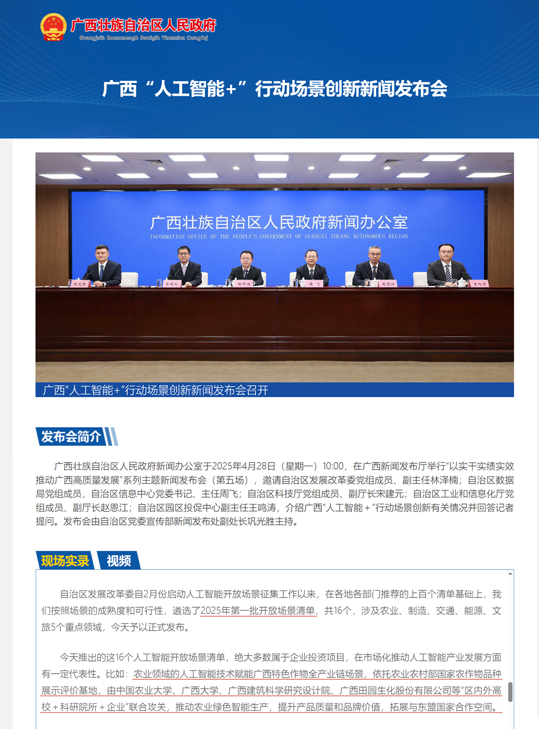 此次彭副市長一行的調(diào)研,正值我院深度參與研發(fā)的“人工智能技術(shù)賦能廣西特色作物全產(chǎn)業(yè)鏈”項目取得里程碑式進展——該項目憑借其卓越的創(chuàng)新性、深遠的應(yīng)用前景及扎實的前期工作基礎(chǔ),成功入選廣西壯族自治區(qū)人民政府新聞辦公室最新權(quán)威發(fā)布的2025年第一批“人工智能+”行動開放場景清單(全區(qū)共16個)。這一殊榮標志著該項目在人工智能與農(nóng)業(yè)交叉領(lǐng)域技術(shù)創(chuàng)新的前瞻性和實踐價值獲得了自治區(qū)層面的高度認可。
