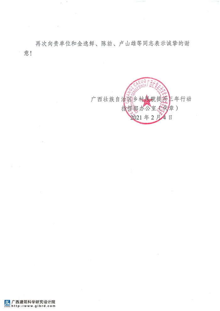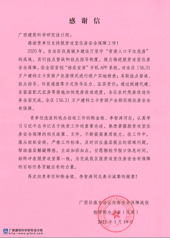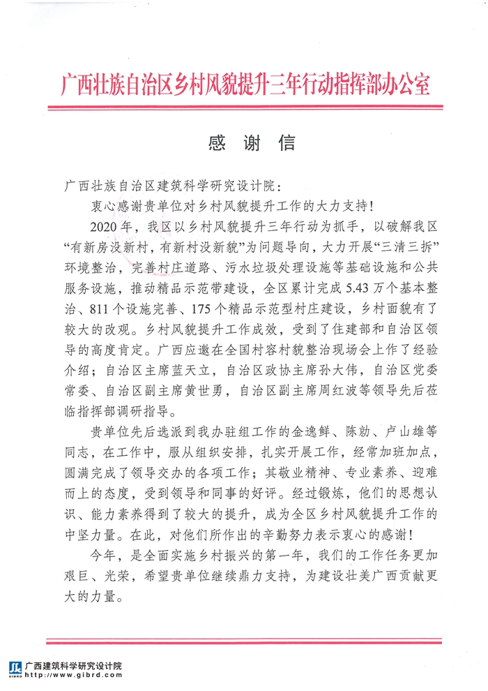 會上,劉哲處長介紹了到我院召開座談會目的,介紹了2020年全區(qū)鄉(xiāng)村風貌提升工作取得良好的成效,得到了住建部和自治區(qū)領(lǐng)導的高度肯定,自治區(qū)主席藍天立,自治區(qū)政協(xié)主席孫大偉,自治區(qū)黨委常委、自治區(qū)副主席黃世勇,自治區(qū)副主席周紅波等領(lǐng)導先后蒞臨自治區(qū)鄉(xiāng)村風貌提升三年行動指揮部調(diào)研指導。感謝我院積極主動大力配合和支持村鎮(zhèn)建設(shè)處開展脫貧攻堅住房安全有保障、鄉(xiāng)村風貌提升等工作,同時送來了對我院及我院選派到廣西壯族自治區(qū)鄉(xiāng)村風貌提升三年行動指揮部辦公室駐組工作的金逸鮮、陳勍、盧山雄等同志的感謝信。
