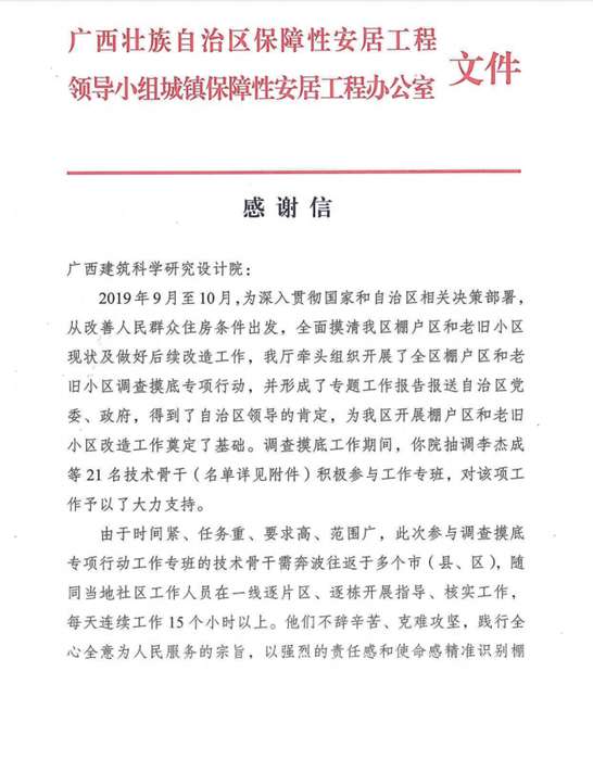 2019年9月至10月,我院選派李杰成副院長(zhǎng)等21名技術(shù)骨干積極參與自治區(qū)住建廳工作專班,全面摸清全區(qū)棚戶區(qū)和老舊小區(qū)現(xiàn)狀及做好后續(xù)改造工作。我院技術(shù)骨干每天工作15個(gè)小時(shí)以上,不辭辛苦、克難攻堅(jiān),踐行全心全意為人民服務(wù)宗旨,以強(qiáng)烈的責(zé)任感和使命感精準(zhǔn)識(shí)別棚戶區(qū)和老舊小區(qū),為勝利完成調(diào)查摸底工作做出了積極貢獻(xiàn),得到自治區(qū)住建廳的表?yè)P(yáng)和感謝。