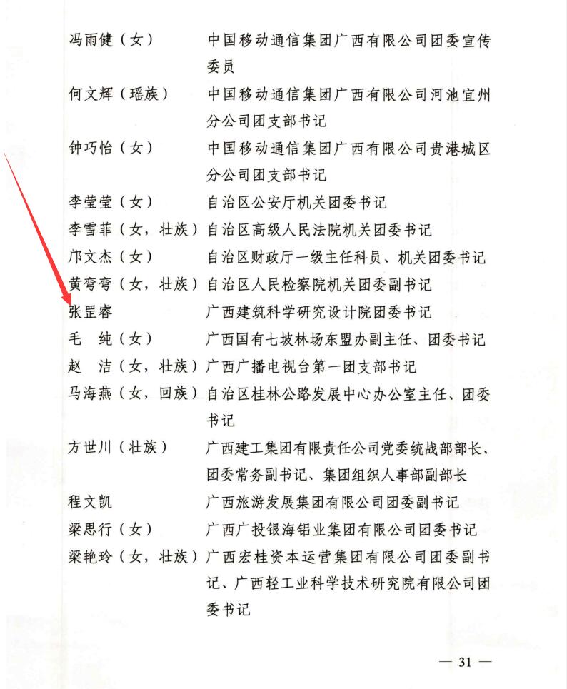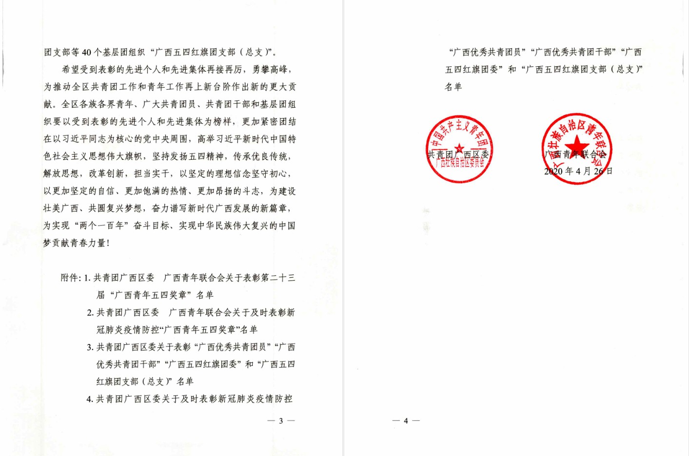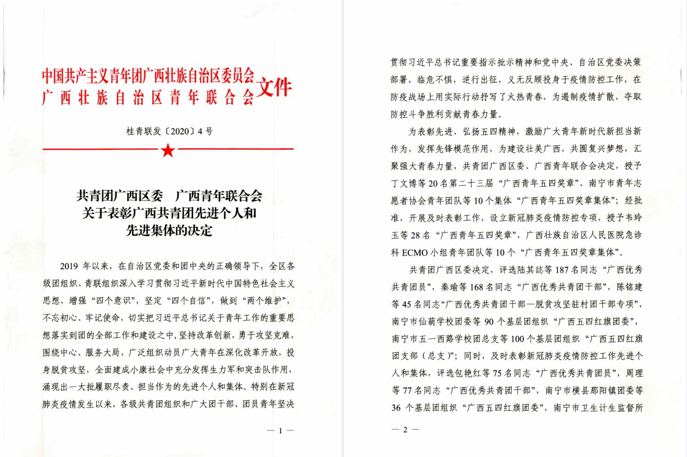 4月26日,共青團(tuán)廣西區(qū)委辦公室印發(fā)了《共青團(tuán)廣西區(qū)委 廣西青年聯(lián)合會(huì)關(guān)于表彰廣西共青團(tuán)先進(jìn)個(gè)人和先進(jìn)集體的決定》(桂青聯(lián)發(fā)〔2020〕4號(hào))文件,我院張罡睿同志被評(píng)為“廣西優(yōu)秀共青團(tuán)干部”。