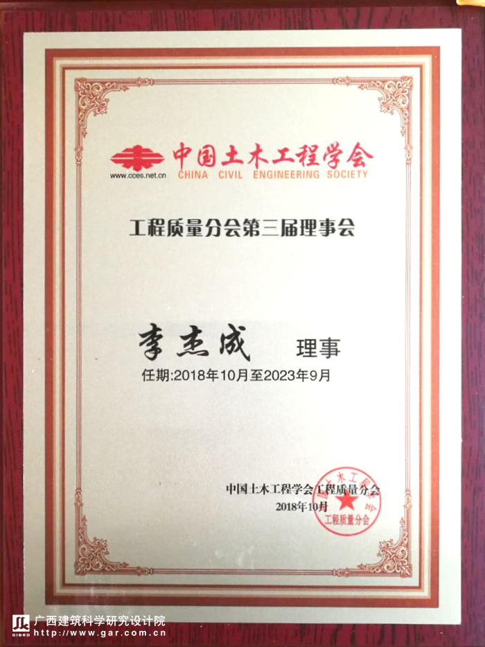 2018年10月16日,中國(guó)土木工程學(xué)會(huì)工程質(zhì)量分會(huì)在福州舉行了第三屆理事會(huì)換屆會(huì)議。我院副院長(zhǎng)、廣西工程勘察設(shè)計(jì)大師、李杰成教授級(jí)高工當(dāng)選為中國(guó)土木工程學(xué)會(huì)工程質(zhì)量分會(huì)第三屆理事會(huì)理事。