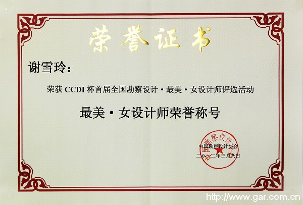 在第102個“三八”國際勞動婦女節(jié)來臨之際,由中國勘察設計協(xié)會主辦、中國勘察設計協(xié)會網(wǎng)站和《工程建設與設計》雜志共同承辦的“CCDI杯首屆全國勘察設計·最美·女設計師評選活動”于2012年3月8日圓滿結束。我院設計三所的優(yōu)秀建筑專業(yè)設計師謝雪玲獲此榮譽。她是我院選送的5名參賽者中,唯一獲獎的選手。 本次活動自2月7日開始,歷經(jīng)一個月的時間,共有全國25個省市自治區(qū)150家勘察設計單位推薦的449名候選人參加評選。通過網(wǎng)絡投票、評審委員會的評審,共評選出100名最美女設計師。