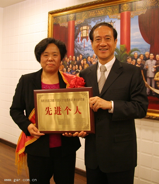 2011年11月30日上午,由中央統(tǒng)戰(zhàn)部、人力資源和社會保障部、各民主黨派中央委員會、中華全國工商業(yè)聯(lián)合會聯(lián)合發(fā)起的“各民主黨派、工商聯(lián)、無黨派人士為全面建設(shè)小康社會做貢獻(xiàn)表彰大會”在北京人民大會堂隆重舉行,中共中央政治局常委、全國政協(xié)主席賈慶林在會上親切接見了獲表彰的代表并做重要講話。中央統(tǒng)戰(zhàn)部杜青林部長,人力資源和社會保障部尹蔚民部長,全國人大常委會副委員長、民革中央主席周鐵農(nóng),全國人大常委會副委員長、民盟中央主席蔣樹聲,全國人大常委會副委員長、民建中央主席陳昌智,全國政協(xié)副主席、民進(jìn)中央常務(wù)副主席羅富和,全國人大常委會副委員長、農(nóng)工黨中央主席桑衛(wèi)國,致公黨中央常務(wù)副主席王欽敏,全國人大常委會副委員長、九三學(xué)社中央主席韓啟德,全國政協(xié)副主席、九三學(xué)社中央副主席王志珍,全國政協(xié)副主席、臺盟中央主席林文漪,全國政協(xié)副主席、全國工商聯(lián)主席黃孟復(fù),無黨派人士、衛(wèi)生部部長陳竺等46位領(lǐng)導(dǎo)同志出席表彰大會。中央統(tǒng)戰(zhàn)部杜青林部長在會上做了重要講話。30日晚上的央視新聞聯(lián)播報(bào)道了此次表彰大會的盛況。