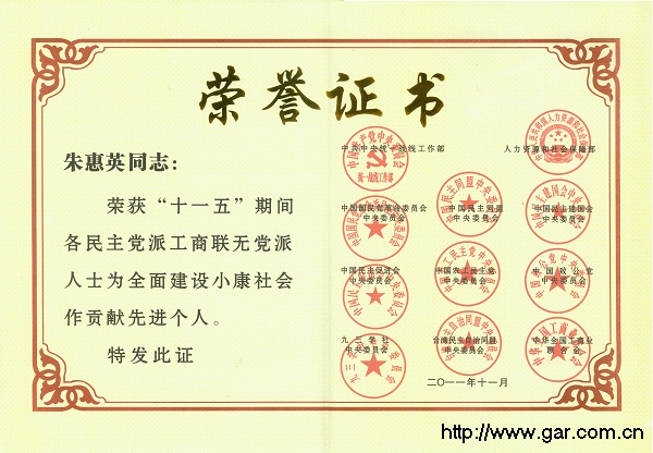 朱惠英副院長榮獲“‘十一五’期間各民主黨派、工商聯(lián)、無黨派人士為全面建設(shè)小康社會做貢獻(xiàn)先進(jìn)個(gè)人”榮譽(yù)稱號 獎(jiǎng)狀