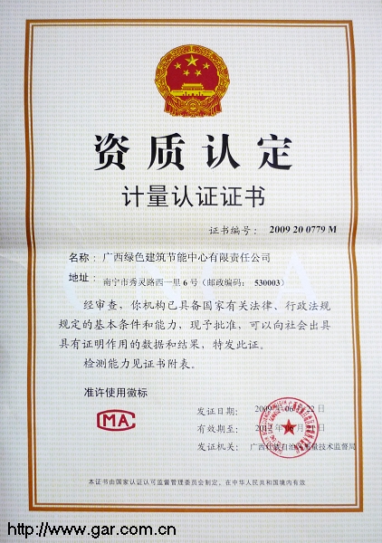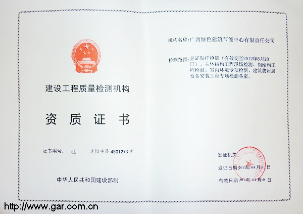 廣西綠色建筑節(jié)能中心有限責(zé)任公司于2009年6月22日獲自治區(qū)質(zhì)量技術(shù)監(jiān)督局頒發(fā)的計量認(rèn)證資質(zhì)認(rèn)定,并于2011年4月11日獲自治區(qū)住建廳頒發(fā)的建設(shè)工程質(zhì)量檢測機構(gòu)資質(zhì)。