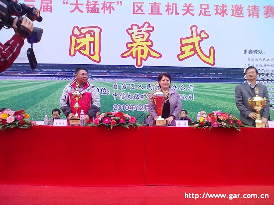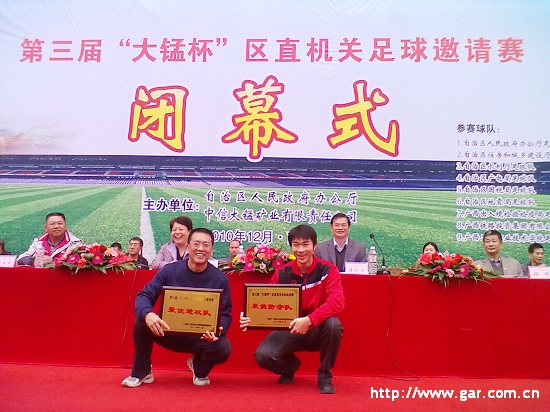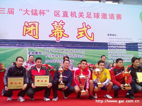 2010年12月12日我院足球隊在院工會主席楊萍帶領(lǐng)下一行約20多人到廣西體育中心參加第三屆“大猛杯”區(qū)直機(jī)關(guān)足球邀請賽閉幕式儀式。第三屆“大錳杯”區(qū)直機(jī)關(guān)足球邀請賽由自治區(qū)人民政府辦公廳與中信大錳共同主辦。參賽球隊由自治區(qū)人民政府辦公廳、自治區(qū)住建廳、水利廳、廣電局、國稅局、地震局、廣西出入境檢驗檢疫局、鐵路投資集團(tuán)、廣西工業(yè)職業(yè)技術(shù)學(xué)院、國開行廣西分行、農(nóng)行廣西分行、中行廣西分行、建行廣西分行、光大銀行南寧分行、北部灣銀行、中信銀行廣西分行、中信大錳等17支單位足球隊組成。