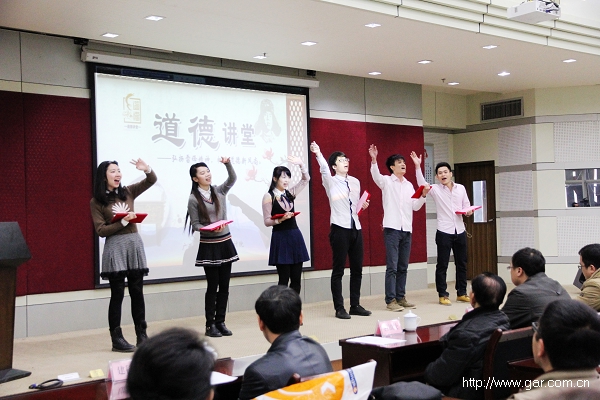 根據(jù)創(chuàng)建全國(guó)文明單位測(cè)評(píng)體系相關(guān)要求,“道德講堂”活動(dòng)分為五個(gè)環(huán)節(jié):“賞一段舞蹈”、“學(xué)一位模范”、“唱一首好歌”、“看一段視頻”、 “讀一段經(jīng)典”、“談一點(diǎn)感受”。