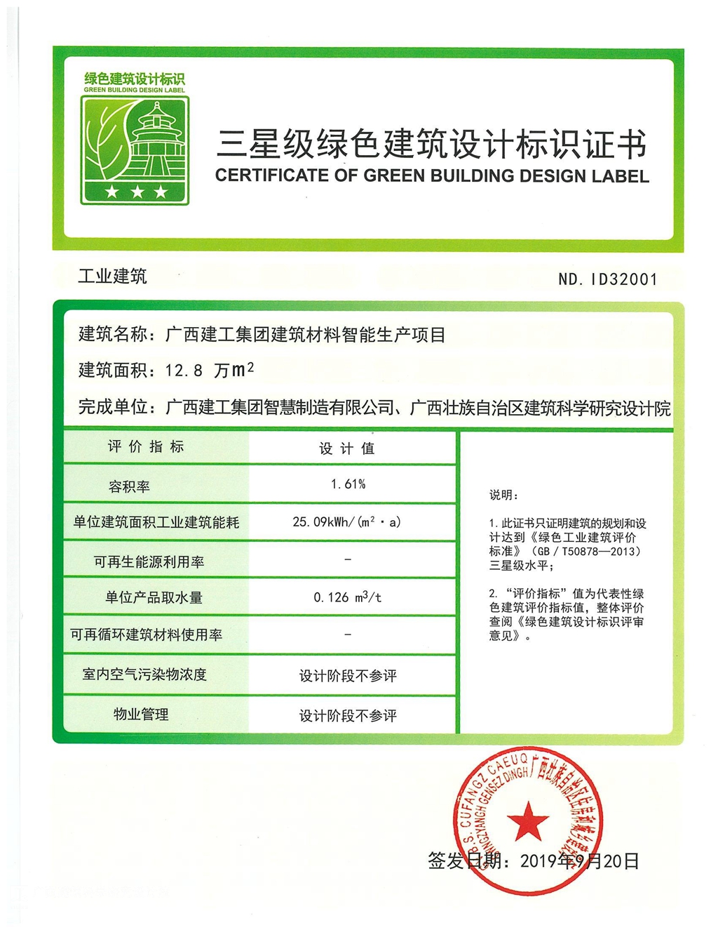 本項(xiàng)目于2019年6月申報(bào)綠色建筑設(shè)計(jì)標(biāo)識(shí),于2019年9月獲得三星級(jí)綠色建筑設(shè)計(jì)標(biāo)識(shí)證書(工業(yè)建筑),成為廣西首個(gè)獲得三星級(jí)綠色工業(yè)建筑的項(xiàng)目。