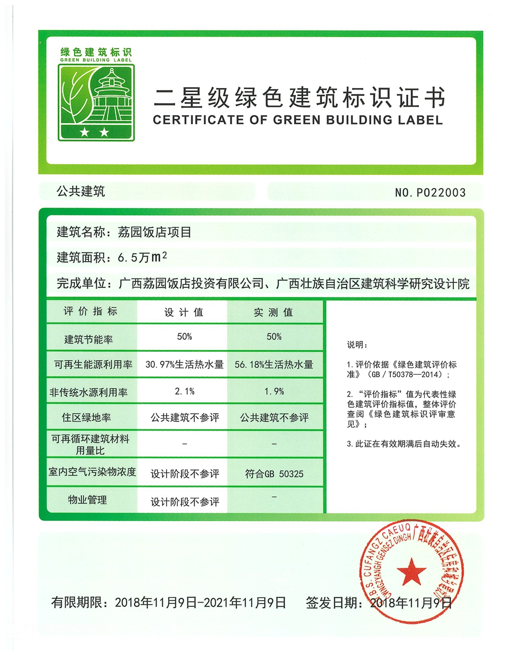 本項(xiàng)目的結(jié)構(gòu)形式為框架,多層民用建筑,耐火等級為一級,為五級旅館建筑。建筑物的抗震設(shè)防烈度為六度,建筑設(shè)計使用年限為50年。工程性質(zhì)為旅館建筑,由廣西荔園飯店投資有限公司開發(fā)建設(shè),設(shè)計單位為華東建筑設(shè)計研究院有限公司,綠建咨詢單位為廣西壯族自治區(qū)建筑科學(xué)研究設(shè)計院。開發(fā)與建設(shè)周期:2015年3月1日~2017年6月30日。本項(xiàng)目于2019年8月被評為2019年度廣西優(yōu)秀工程勘察設(shè)計成果綠色建筑一等等次。